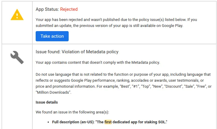 We got rejected a few more times after getting past the “impersonation violation”, mostly due to more store metadata issues. For example, at one point we had a sentence in our app store description that said, “The first dedicated app for staking SOL.” This goes against Google Play store guidelines.