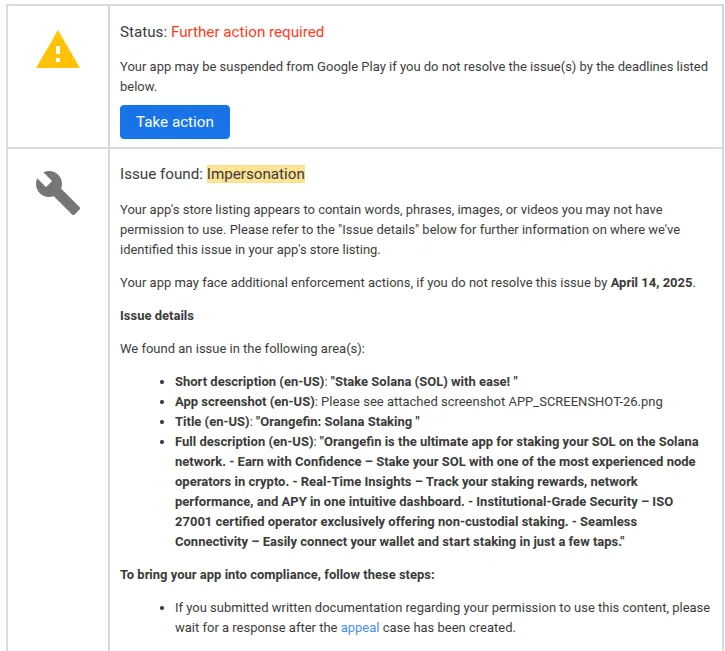 To resolve this issue, we ultimately changed the Play Store name from “Orangefin: Solana Staking” to “Orangefin: SOL Staking.”