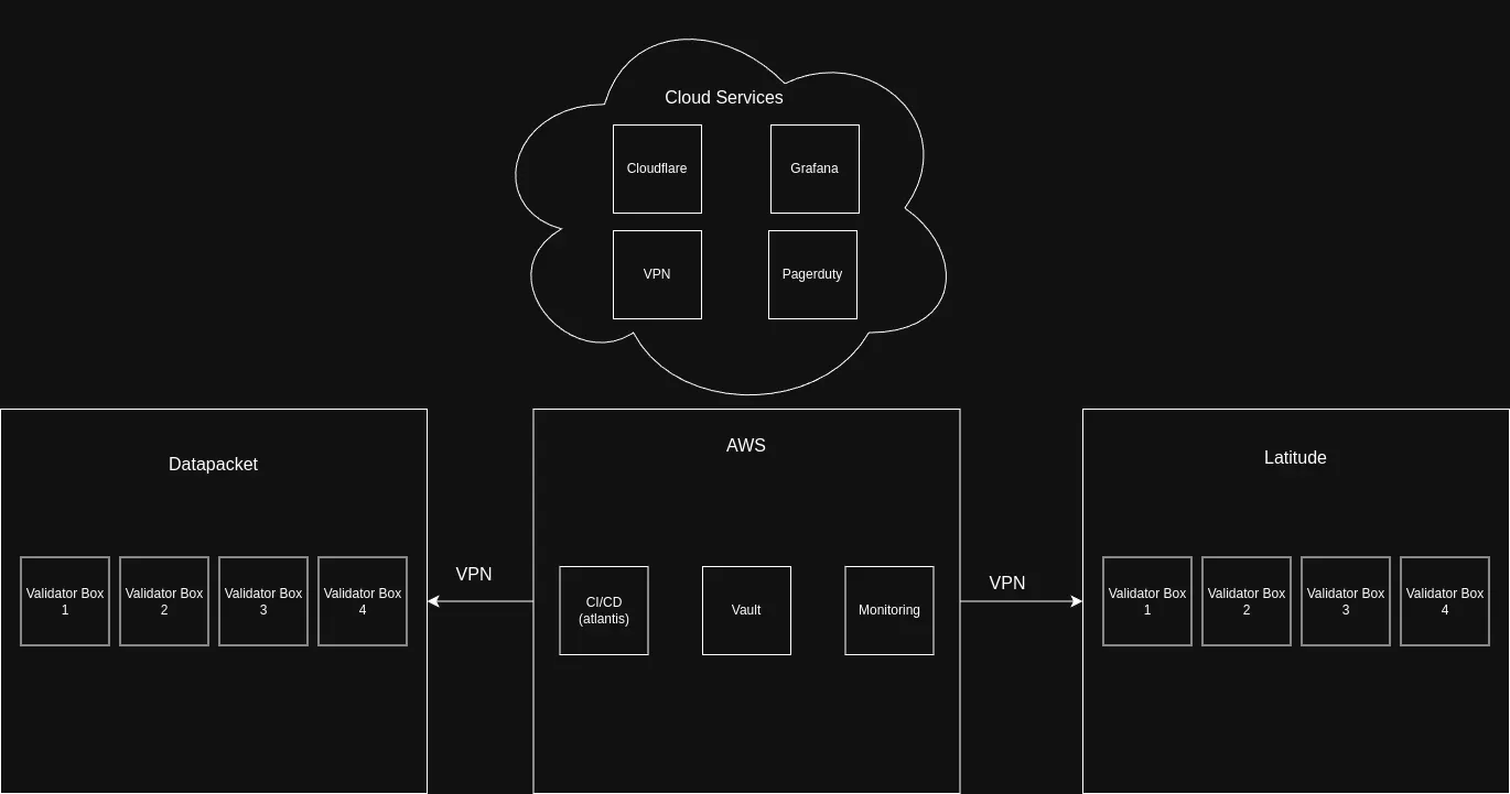 - VPN: We run a VPN where a box or pod in one environment can talk to another box in a different environment, all over private routes, and protected by strict ACLs. As an example, our CI/CD system runs in AWS and deploys a validator in Datapacket and Latitude all directly over private routes.