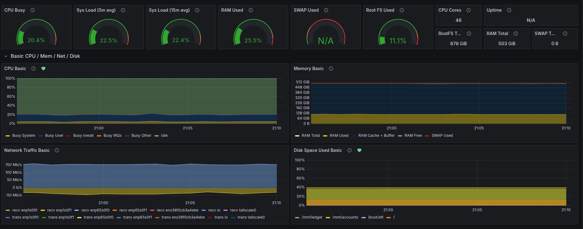 Each validator server runs Node Exporter with dashboards in Grafana. These dashboards themselves have alerts tied to them such as Disk Space Used Basic which you can see by the green heart in the picture above.