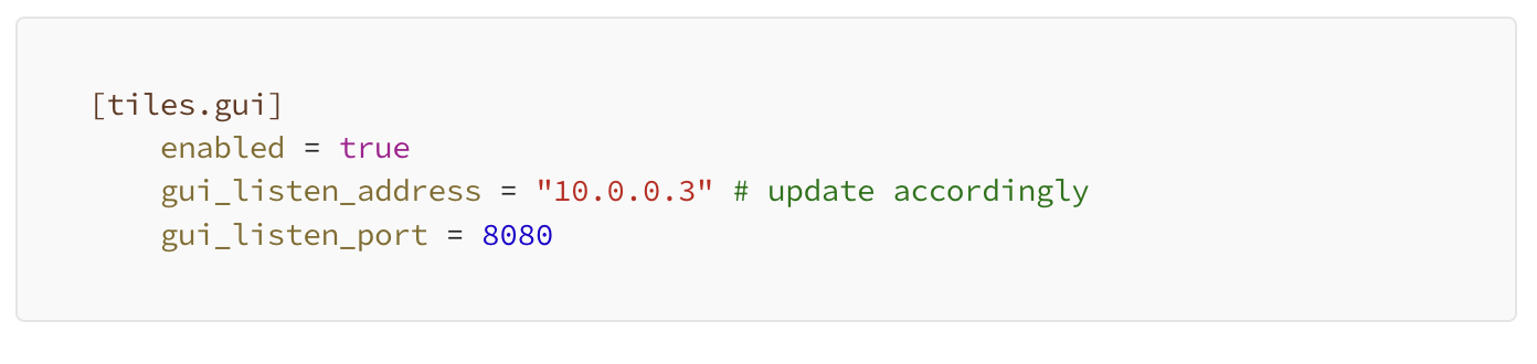 All of our nodes have an interface on them with a private IP on them so traffic can be routed between environments, depending on network ACLs and firewalls. This gives us the benefit of being able to bind the firedancer GUI on a private IP. To set up the Firedancer to bind on a private interface, update your config.toml with the following configuration.