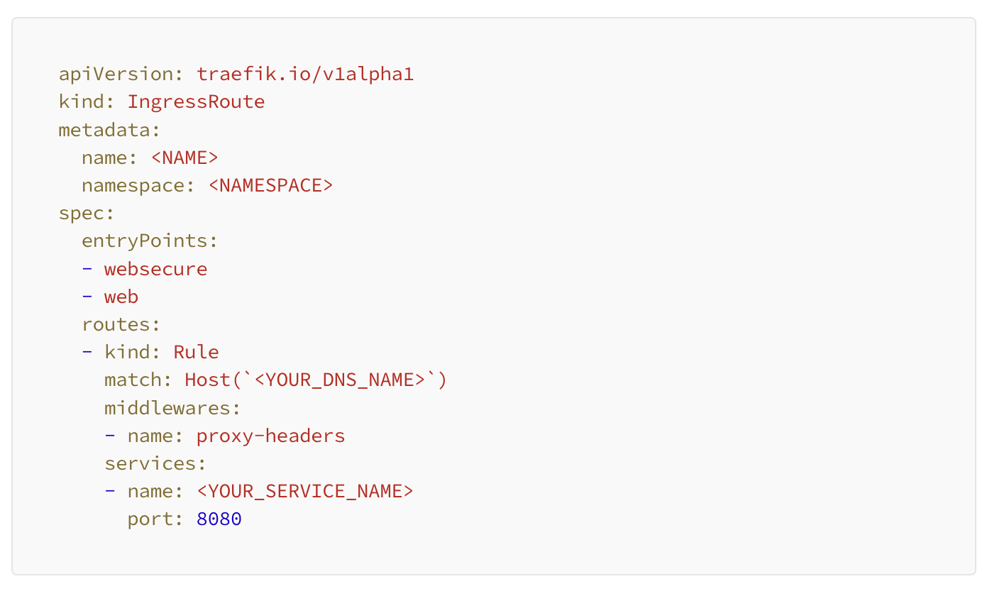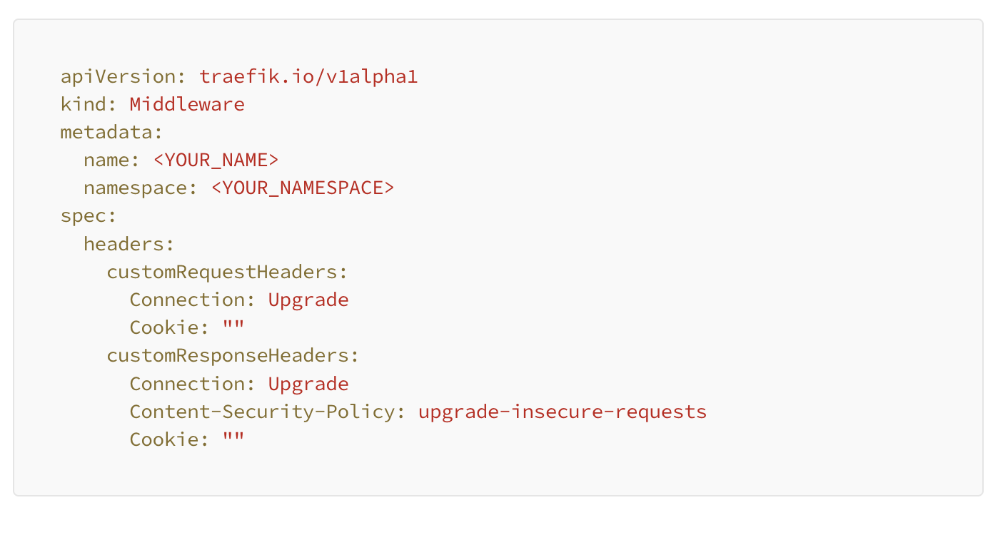 Next, we create an IngressRoute as well as a Middlewareto listen for traffic on a specific hostname as well as adding and removing some specific headers.