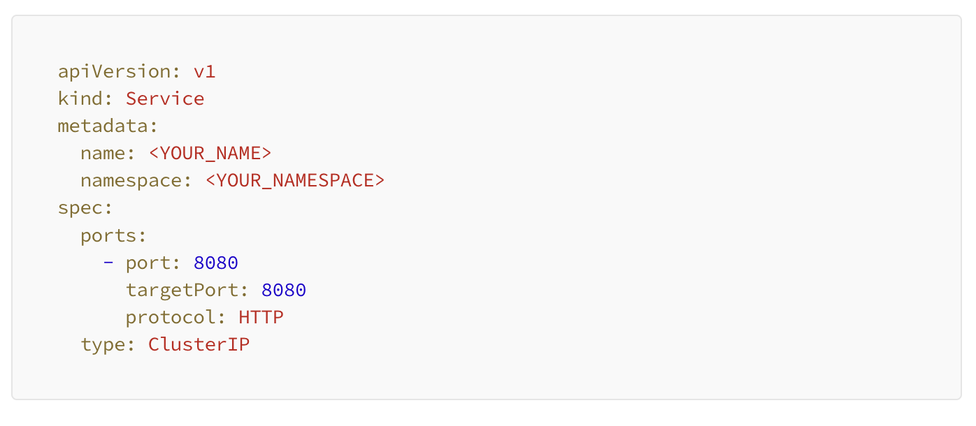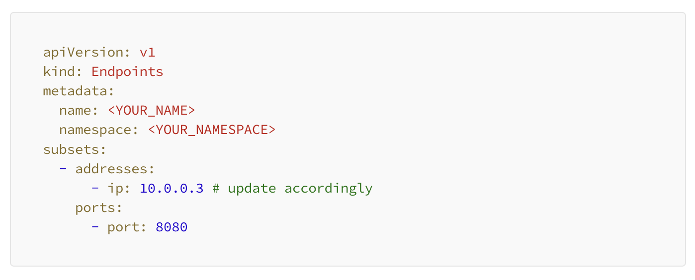 Next we create a serviceandendpoint in Kubernetes. Optionally, you can set up something like nginx, however the below set up we viewed as simpler with less maintenance.